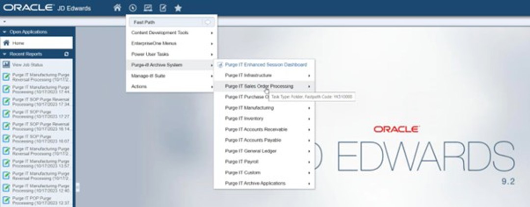 All the Purge-it Applications, enquiries and batch jobs are available from the JD Edwards menus.